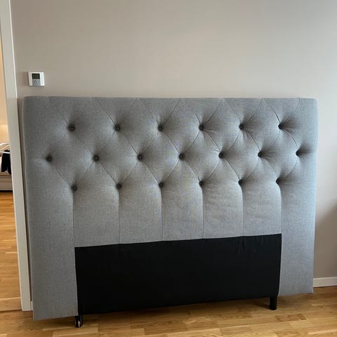Säng med madrass Sängen har en mörkgrå klädsel och vita ben. Passar för sovrum och erbjuder en enkel och funktionell sovlösning.