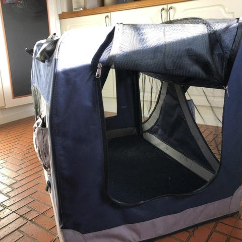 Tygbur för husdjur i rosa och svart färg. Burens material är tyg och den är utformad för att vara bärbar och användbar för transport eller tillfällig inhysning av husdjur.
