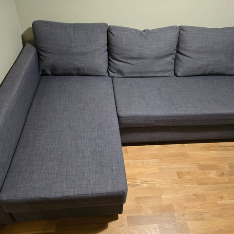Säljer en stilren och bekväm hörnbäddsoffa i mörkgrå färg.