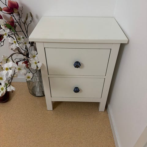 Sängbord från ikea, ok skick, custom handtag från Åhléns. Finns matchande större byrå / sängbord.