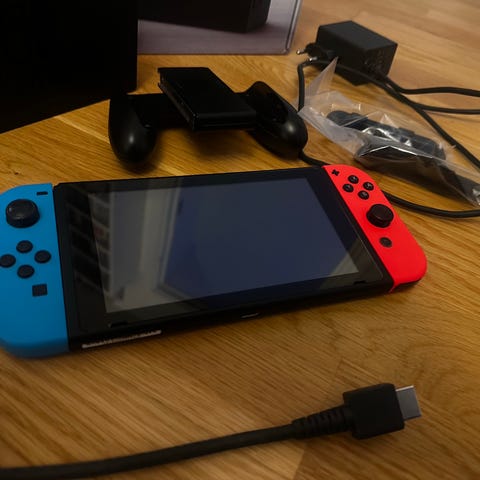Nintendo Switch spelkonsol med Joy-Con-kontroller i röd och blå färg. Inkluderar flera spel för olika genrer. Konsolen har en bärbar design som möjliggör spel både hemma och på resande fot. Strömadapter och nödvändiga kablar medföljer.
