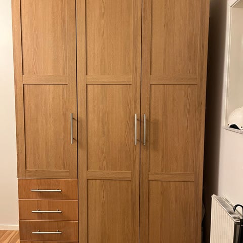 Hemnes garderob från Ikea. Utgången ur sortimentet. Den inre dörren glider inte riktigt lika jämnt som den yttre av oklar anledning, finns en ganska diskret spricka i en av dörrarna samt ett skrapmärke längst ned. Finns på gryta i Västerås.