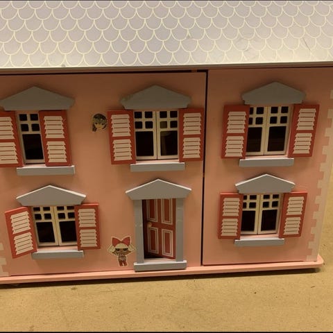 Fint dockhus som går att fälla ihop. Dockor och möbler ingår.