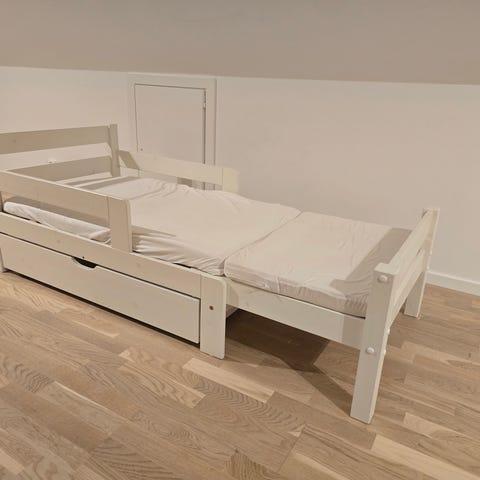 IKEA utdragbara säng för barn med maxlängd 208 cm, bredd 90 cm och huvudgavels höjd 100 cm. Madrassmått är 200 cm i längd och 80 cm i bredd. Sängen har en max belastning på 100 kg.
