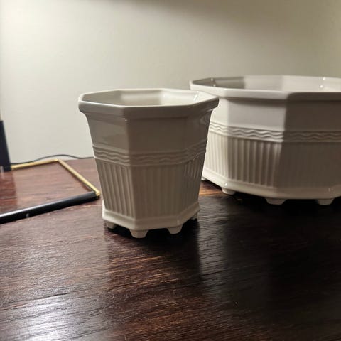 Info från hemsidan: En låg och vid variant av den klassiska WALDEMARSUDDEKRUKAN®. Även denna variant designade Prins Eugen själv och lät Gustavsberg tillverka. Den lämpar sig för julgrupper och blomsterarrangemang, eller som fruktskål. Denna variant har kommit att bli en klassisk och uppskattad bröllops och avtackningsgåva.