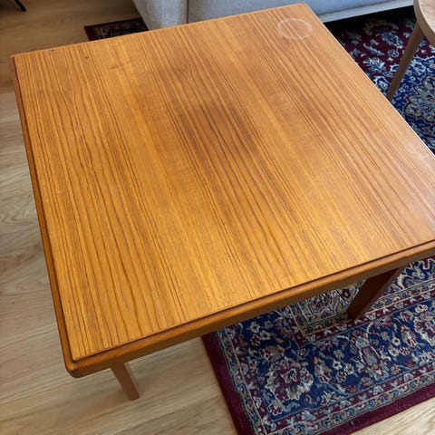 Runt soffbord i trä, med mahogny- eller teakfanér på ovansidan.