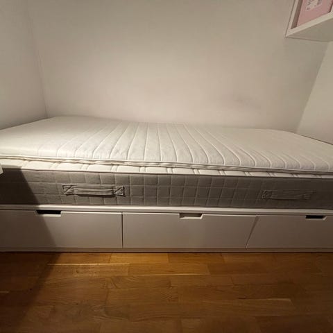 IKEA Nordli sängstomme med förvaring i vitt, dimension 90x200 cm. Sängstommen har inbyggda lådor för förvaring och är anpassad för enkel organisering av sovrummet. Sliten, men hel. Ett hål för eluttag gjort på höger långsida (från fotsidan sett) av ramen. Pris kan diskuteras vid snabb affär.