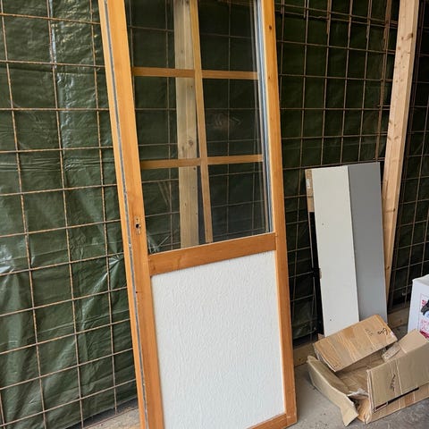 Glas i största delen av dörren trä nertill. Finns även nyckel och något form av inbrottskydds list.