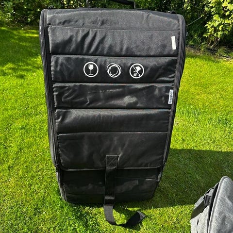 Bugaboo transportväska. Köpt ny av oss, använd ett fåtal resor. Fint skick, saknar dock en dragare/handtaget i dragkedjan men funkar att stänga och hela dragkedjor. Hjulväska och axelrem medföljer. Har funnits en instruktionsbok över hur man kan packa men är osäker på om jag kommer att hitta den. Rymmer bla. Bugaboo Donkey duo.