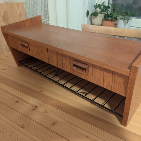 Ett jättefint och lagom stort väggmonterat nattduksbord. En låda och så galler under.