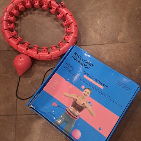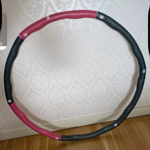 Hulahoppring med segment i flera färger inklusive rosa, gul, lila och blå. Ringen är av plast och är bra för träning. Går att anpassa storlek.