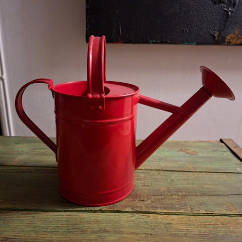 Vattenkanna i metall med guldfärgad yta. Har ett långt pip och ett handtag för enkel användning. Passar för bevattning av växter.
