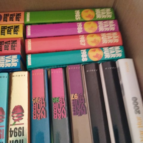 Samling av När Var Hur böcker med olika årgångar.