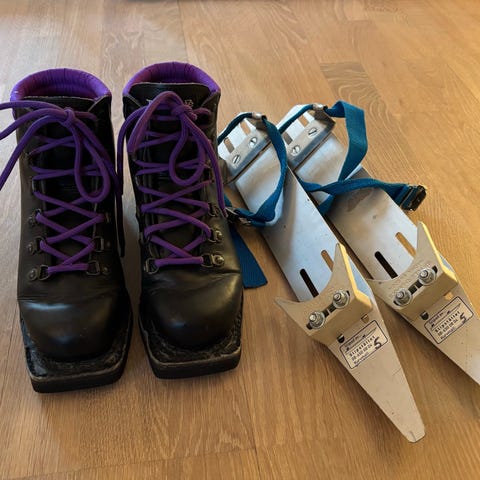 Långfärdsskridskor i storlek 38, med ispicka/ stav. Nyslipade, dessutom slipade så att åkradien förnyats.
