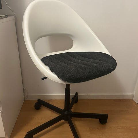 Säljer en modern skrivbordsstol med vit sits och grå underrede. Snurrbar och höj-/sänkbar, rullar lätt på hjul. Bekväm att sitta länge på och passar perfekt till hemmakontor eller studier.