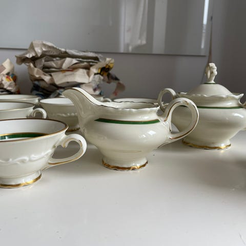 Servis med tallrikar, karaff, såssnipa och flera uppläggningsfat