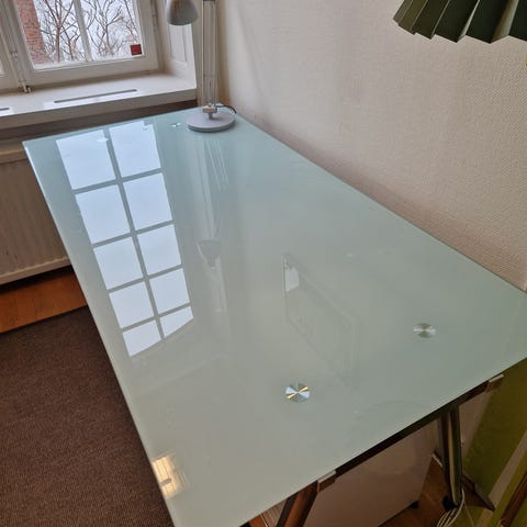 Vitt (högblank) skrivbord med frostad glasskiva och hurts med tre lådor.