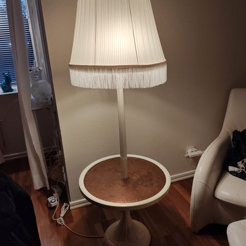 Fantastisk lampa med bord. Gammal kontakt så jag vet inte om den fungerar. Bordskivan behöver lite bets eller färga