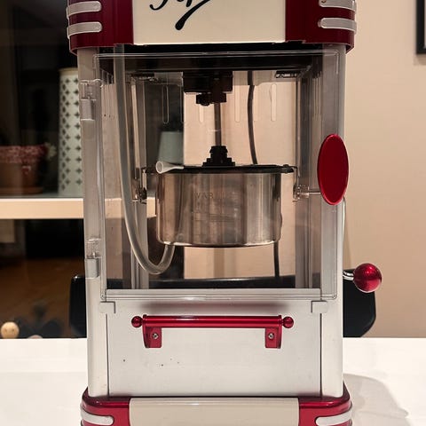 Popcornmaskin med retro design i rött och vitt. Maskinen är tillverkad med plast och metall och har ett genomskinligt hölje som visar popcornens tillagningsprocess. Utrustad med en vred och en gryta i rostfritt stål för popcornkärnor. Strömkabel ingår.