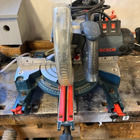 Metabo kap- och geringssåg med justerbar vinkel för precisa snitt. Utrustad med skyddshölje och stabilt fäste för säker användning. Passar för träbearbetning och snickeriarbeten.