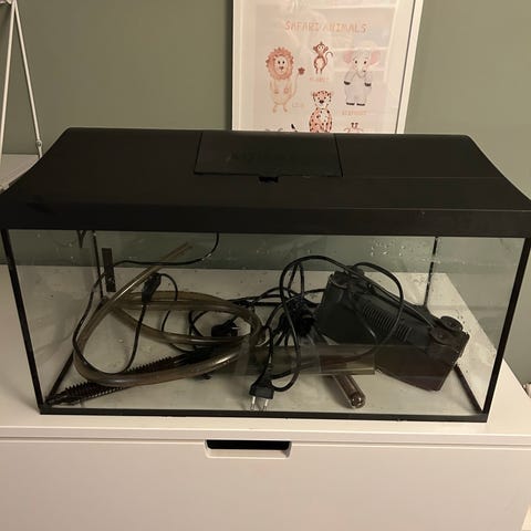 Akvarium med svart lock, inklusive belysning, filter och grus. Värmare medföljer tyvärr inte