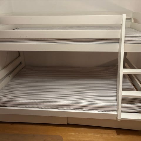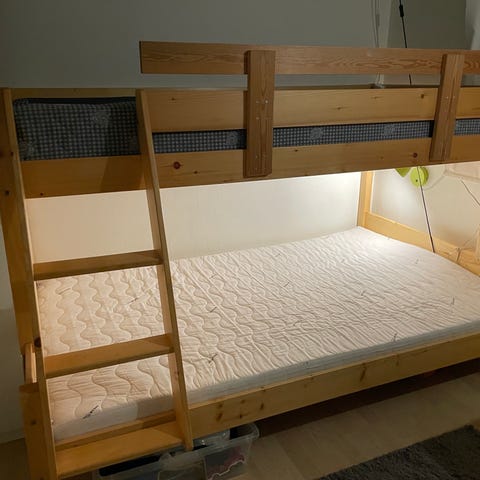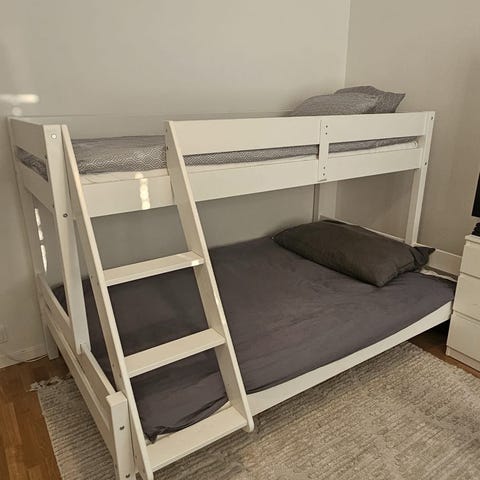 En våningssäng från Svenska Hem med underbädd 120cm samt överbädd 90cm. En yteffektiv sänglösning med stabil stomme. De extra förvaringlådorna på hjul maximerar förvaringen i rummet.