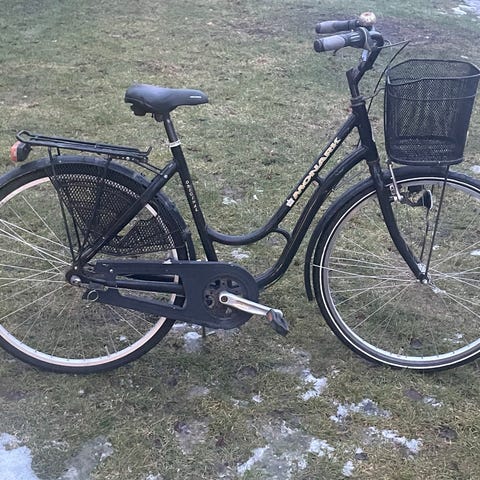 Crescent 28” med 7vxl, handbroms, fotbroms, ringklocka, cykelkorg, batterilyse bak, navdynamo lyse fram, ramlås, reflexer, stabil damcykel som fungerar fint.