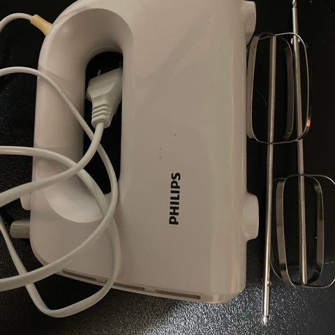 Färgen är vit och apparaten är avsedd för köksbruk, främst för att blanda och vispa ingredienser vid matlagning och bakning.