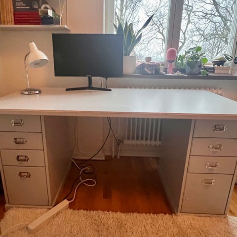 Skivan kommer från ett större svängt skrivbord och har sågats av i bakkant, syns inte från ovansidan. Se bilder.