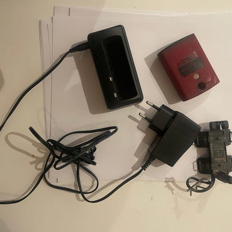 Har fäste och laddare.
