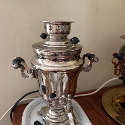 Samovar tillverkad i koppar med handtag av trä. Används för att värma och hålla vatten varmt, ofta för att brygga te. Har en traditionell design med kran för att hälla upp vätska.