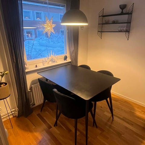 Säljer ett stilrent matbord med fyra bekväma stolar. Bordet har en mörk skiva och stolarna är klädda i en neutral färg i sammet tyg. Matgruppen är i gott skick och sparsamt använd.