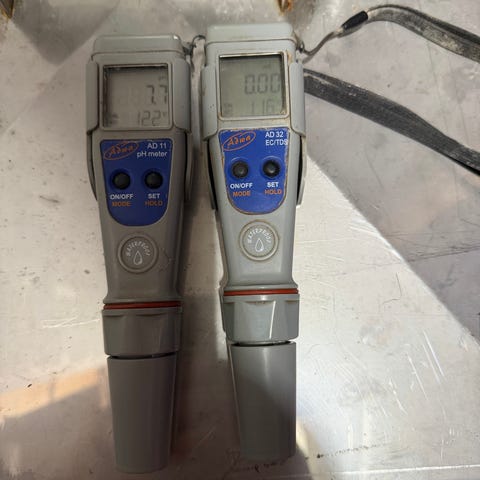 Två växtlighetstestare för att mäta fuktighet, ljus och pH-värde i jorden.