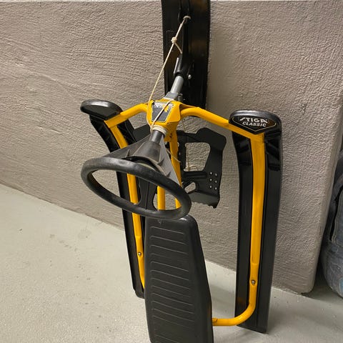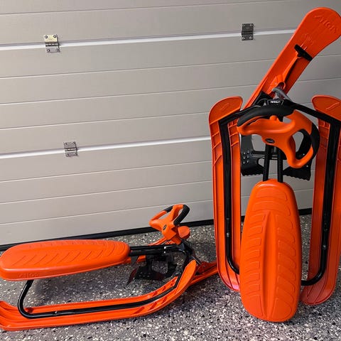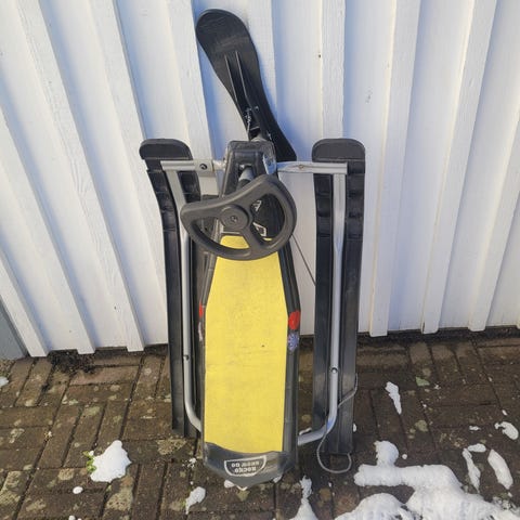 Snowracer rattkälke i gul och svart färg. Kälken har en ratt för styrning och är utrustad med en sits för en person. Den är avsedd för användning i snö och är tillverkad av hållbara material för vinterlek.