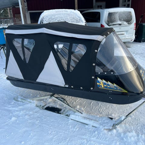 Framrutan är i okrossbar och köldtålig plast. Pulkan har en hylla fram för småprylar och det sitter en stötupptagande sarg runtom hela pulkan.