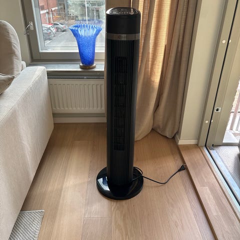 Blyss QN-2050C tornfläkt i vitt med kontrollpanel på toppen. Med LED display, den har funktioner för natt läge, roterande luft flöde, timer, nedkylning (med vatten/is) samt olika typer och styrka av luft flöde. Utrustad med vattenbehållare för luftfuktning och avtagbart filter (som är helt rent och behöver ej bytas). Fläkten har flera hastighetsinställningar och är avsedd för inomhusbruk. Vatten/is krävs inte för att den ska fungera, men alternativet finns. Båda säljs för 1000 kr. De har använts sparsamt och säljs då vi inte längre behöver dem.
