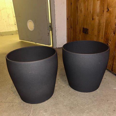 utomhuskrukor i olika storlekar och utförande. Dem 2 till vänster är i plats och dem andra tre till höger i betong liknande material samt den höga krukan i betong liknande material. Mått finns att få om så önskas.