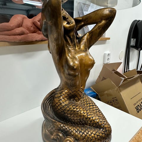 Skulpturbord med en staty som bas och en rund glasbordsskiva ovanpå. Bordet är dekorativt och kan användas som sidobord eller prydnadsbord i olika rum. Materialen inkluderar glas för bordsskivan och ett skulpturellt material för basen.