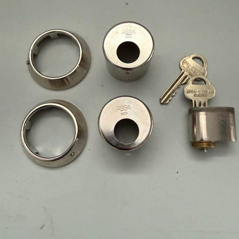 Två Assa låscylindrar med flera nycklar/cylinder.