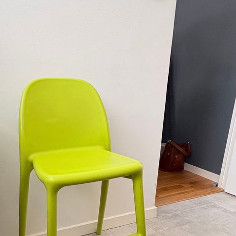 Jollyroom barnstol i rosa färg, tillverkad i formgjuten plast med inbyggd säkerhetssele. Stolen är utformad för små barn och erbjuder stöd och säkerhet vid sittande.