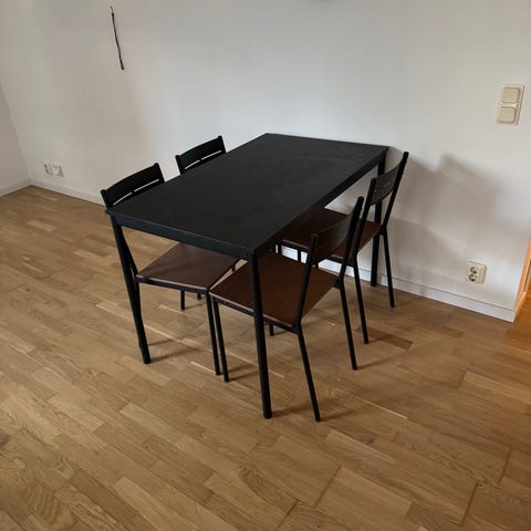Ikea matbord med 2 inläggskivor som göms under bordet när man vill korta ner det. 6 tillhörande stolar.