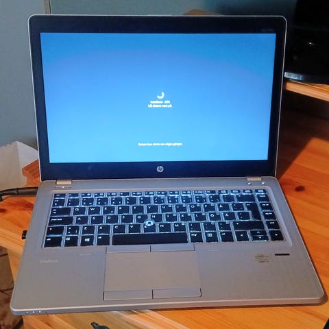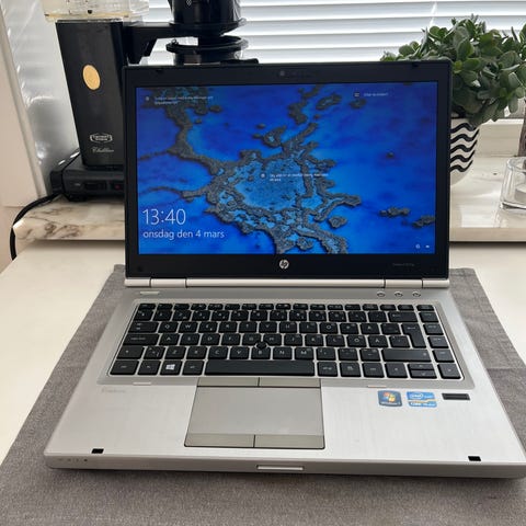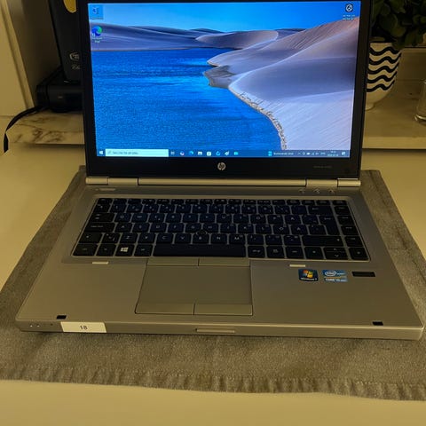 HP laptop med standardtangentbord och pekplatta. En bärbar dator med silverfärgad design och inbyggd webbkamera. Passar för allmän användning.