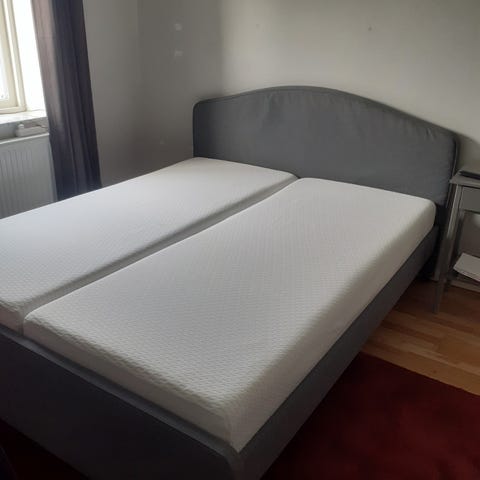 Jysk sängmadrass i mörkt mönstrat tyg. Madrassen är avsedd för användning på säng och ger komfort och stöd vid sömn.