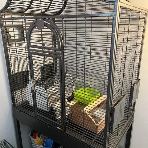 Fågelbur i metall med tillbehör såsom mat- och vattenskålar den finns i värmland de har bott två halsbander i den men den går och tvätta rent ni får skriva med mig när de gäller köpet eftersom den är hoss min tidigare fodervärd som har den hoss sig ni får hämta den med släp och montera nere går men swicha mig först när ni hämtar den hör gärna av sig så har vi kontakten