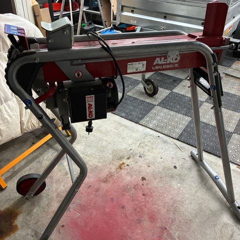 Kapp 45 Vedkap med trästativ. Verktyget är avsett för att kapa ved och är konstruerat för att användas med manuell kraft. Stativet är av trä och ger stabilitet vid användning.