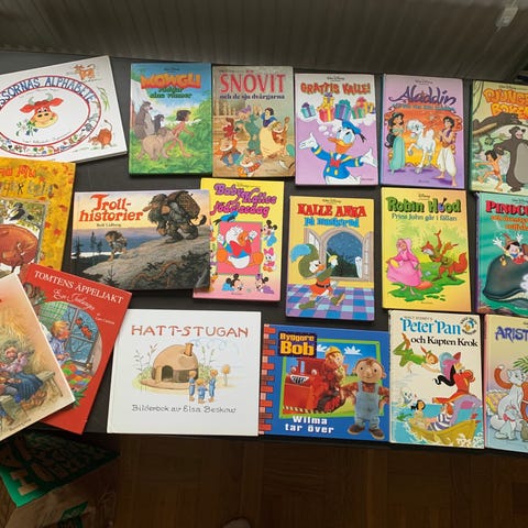 En samling barnböcker med olika titlar och teman, inklusive böcker om djur, fordon och sagor. Böckerna är av varierande storlek och riktar sig till barn i olika åldrar.