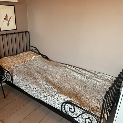 Barnsäng i fint använt skick säljes inkl. ribbotten, stödbräda, madrass, madrasskydd, 2 dra-på-lakan. Mått 70×160.