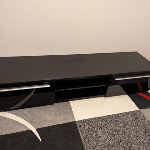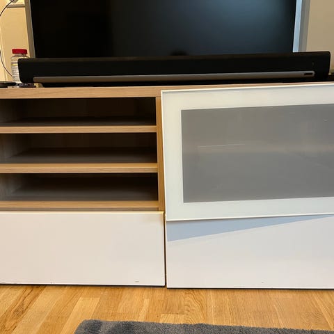 Vit TV / mediabänk från IKEA (tidigare modell Friel) i mycket fint skick. Öppen på baksidan för smidig hantering av sladdar. Luckorna öppnas med push.