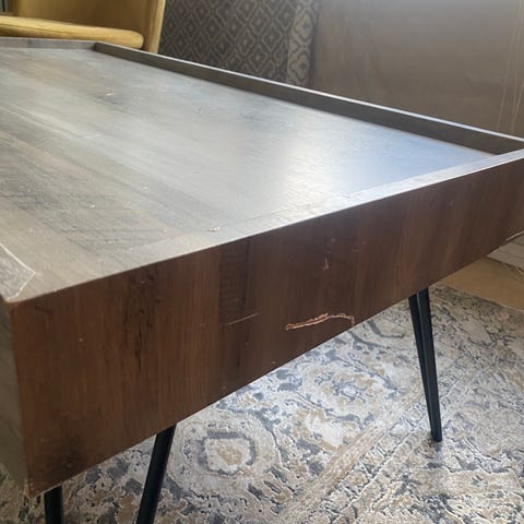 Jysk skrivbord inköpt nytt av mig i somras men som jag insett att jag inte behöver. Skrivbordet har en låda och två fack. Har stått i hem med hundar men knappt varit i närheten av dem då det stått i mitt sovrum. Hämtas av köparen i Motala.