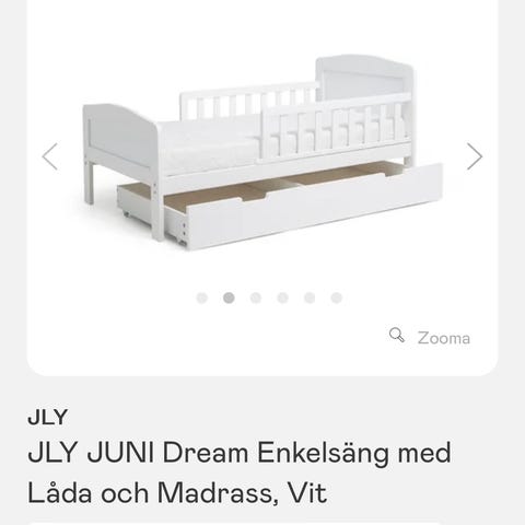Juniorsäng från JLY med en lekfull design. Den har sidor vid sidorna som förhindrar att barnet rullar ur sängen och ett praktiskt förvaringsutrymme undertill. Perfekt som barnets första säng efter att de har vuxit ur sin spjälsäng.